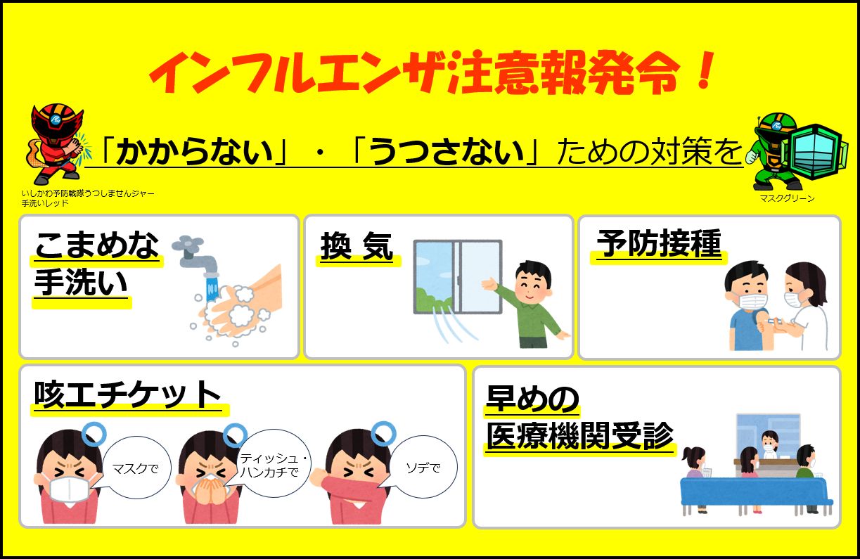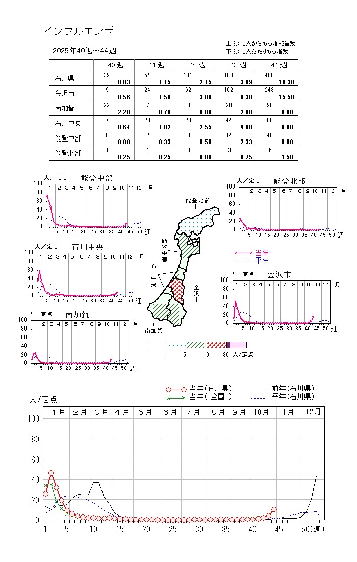 石川県感染症発生動向調査(47定点医療機関)におけるインフルエンザ患者の定点医療機関あたりの報告数が、令和7年第44週(令和7年10月27日~11月2日)で 10.38 人となり、注意報の基準値である10人を超えたため、インフルエンザ注意報を発令しました。